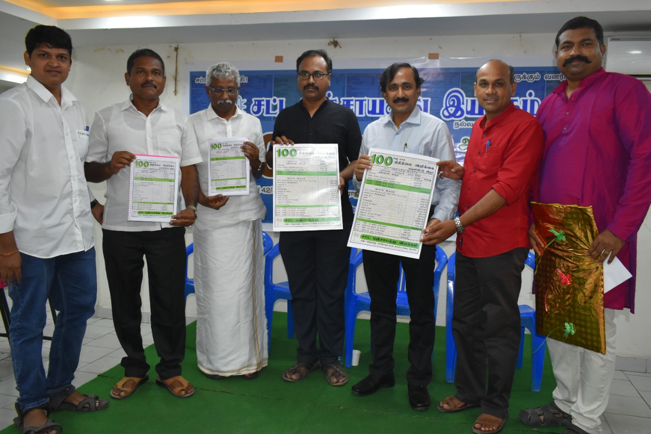 "சட்டத்தின் ஆட்சி", "அனைவருக்கும் வளர்ச்சி" தரும் "நல்லாட்சியை" மலரச் செய்வதற்கான மக்கள் இயக்கமே சட்ட பஞ்சாயத்து இயக்கமாகும். வெளிப்படைத்தன்மையை முன்னிறுத்தி இயக்கத்தின் வரவு-செலவு கணக்கை மக்களின் பார்வைக்கு மாதந்தோறும் வெளியிடுவோம் என்று இயக்கம் துவங்கிய நாள் 14-12-2013 அன்று உறுதி ஏற்றோம். தொடர்ந்து 99 மாதங்களைக் கடந்து, 100 வது மாத அறிக்கை வெளியீட்டு விழா திருவான்மியூரில் உள்ள லட்சுமி மினி ஹாலில் நடைபெற்றது. நேற்று மாலை 4 மணிக்கு தொடங்கிய நிகழ்ச்சியில் 100 மாத நிதி நிலை அறிக்கையை சட்ட பஞ்சாயத்து இயக்கத்தின் தலைவர் திரு. சம்சுகனி வழங்கி, திரு.ஜெயராம் வெங்கடேசன்,ஒருங்கிணைப்பாளர்(அறப்போர் இயக்கம்)மற்றும் திரு.வெ.பொன்ராஜ்,தலைமை வழிகாட்டி(அப்துல் கலாம் லட்சிய இந்திய இயக்கம் ) இணைந்து வெளியிட்டனர். நிகழ்ச்சியில் இயக்க நிறுவனர்களான திரு. சிவ.இளங்கோ மற்றும் திரு. செந்தில் ஆறுமுகம், அ.ஜெய்கணேஷ் மற்றும் மாநில நிர்வாகிகள், மதுரை, நெல்லை , விழுப்புரம், கள்ளக்குறிச்சி, நாகை, திருவண்ணாமலை திருப்பத்தூர் உள்ளிட்ட அனைத்து மாவட்ட நிர்வாகிகள், உறுப்பினர்கள் கலந்து கொண்டனர்.